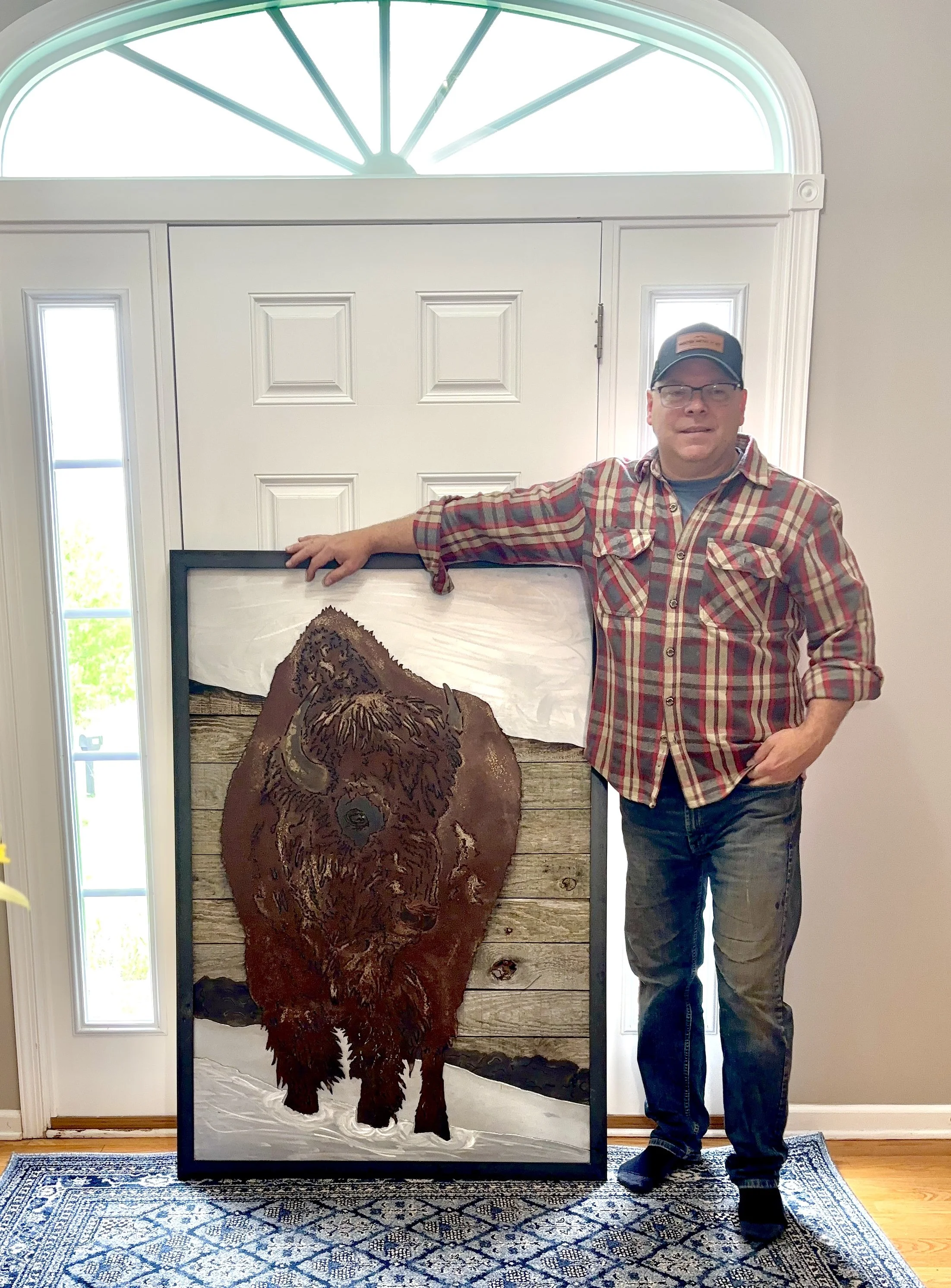 I had the idea of creating this image after our last trip to Banff, Canada in the fall of 2024. I wanted to combine the strength of steel, rust, and hardwood to portray an image of one of the mightiest beasts in North America.