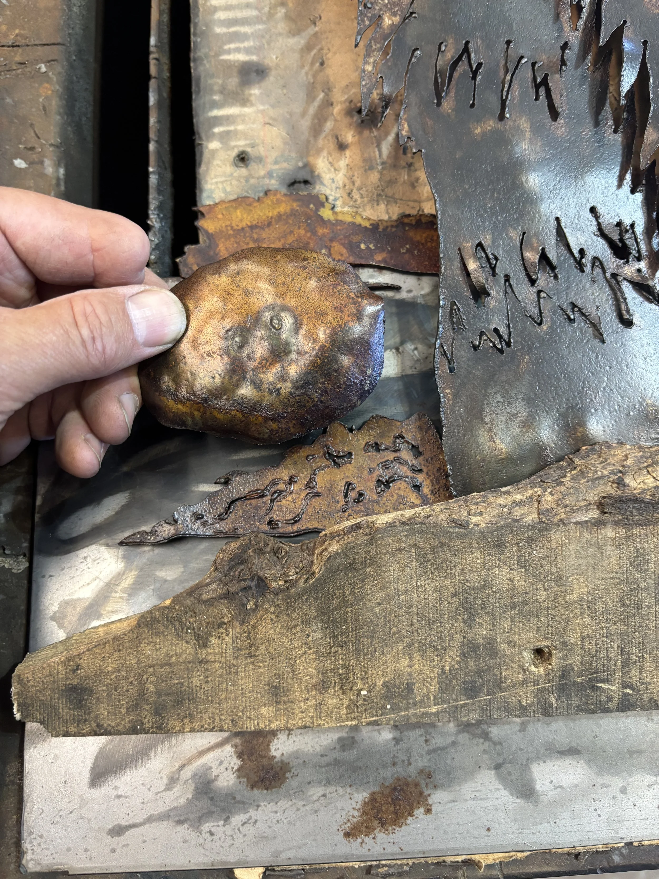 Steel, upcycled wood, patina’d and heat treated metal, raw angle-iron frame.